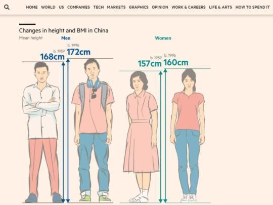 由于营养改善,过去几十年中国居民平均身高有了显著增加。图片来源:《金融时报》网站截图