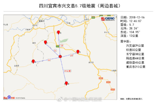 震中距兴文县29公里、距珙县32公里、距长宁县38公里、距筠连县44公里、距云南威信县45公里,距宜宾市64公里,距重庆市215公里。
