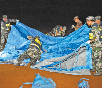 12月16日,在四川省兴文县周家镇临时安置点,救援人员正在搭建帐篷。张可凡摄(新华社发)