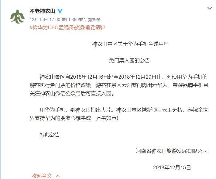 12月15日,河南神农山风景名胜区管理局官方微博发布《神农山景区关于华为手机全球用户免门票入园的公告》。公告称,神农山景区自2018年12月16日起至2018年12月29日止,对使用华为手机的游客执行免门票的价格政策。