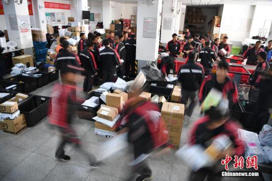 资料图:11月13日,昆明一物流配送网点的工作人员分拣快递。中新社记者 刘冉阳 摄