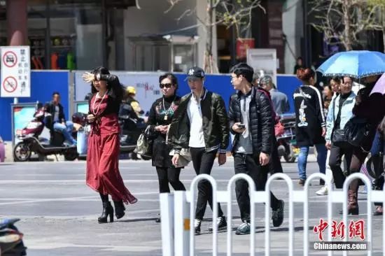 昆明街头穿着四季不同衣服的市民。 任东 摄