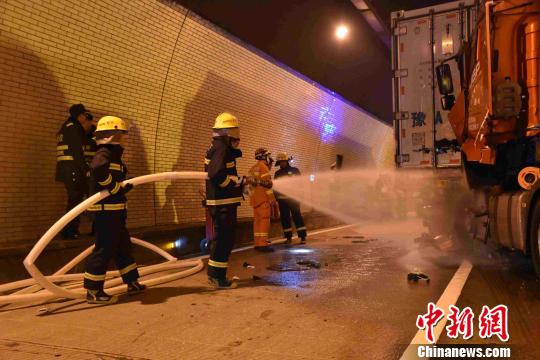 为确保现场不发生二次事故,消防员继续使用水枪对路面进行冲洗稀释,事故隐患全部排除后,交警部门恢复了隧道内的交通,事故具体原因交警部门正在调查。