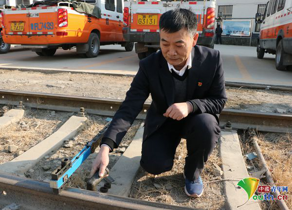 保定工务段保定综合机修车间主任张立昌演示改道扳手使用方法。中国青年网记者 李川 摄