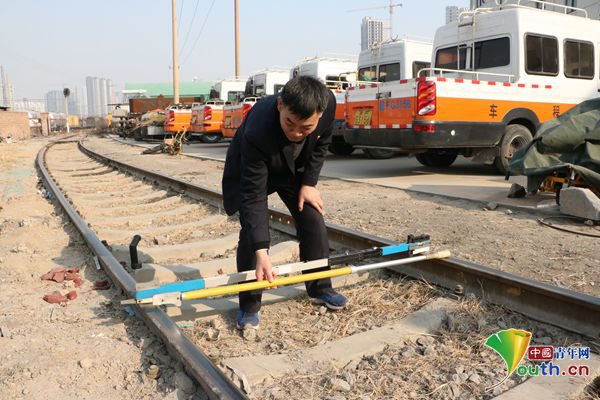 北京铁路局保定工务段保定线路车间养路工张旭介绍道岔立螺栓尼龙套取出器使用方法。中国青年网记者刘喆 摄