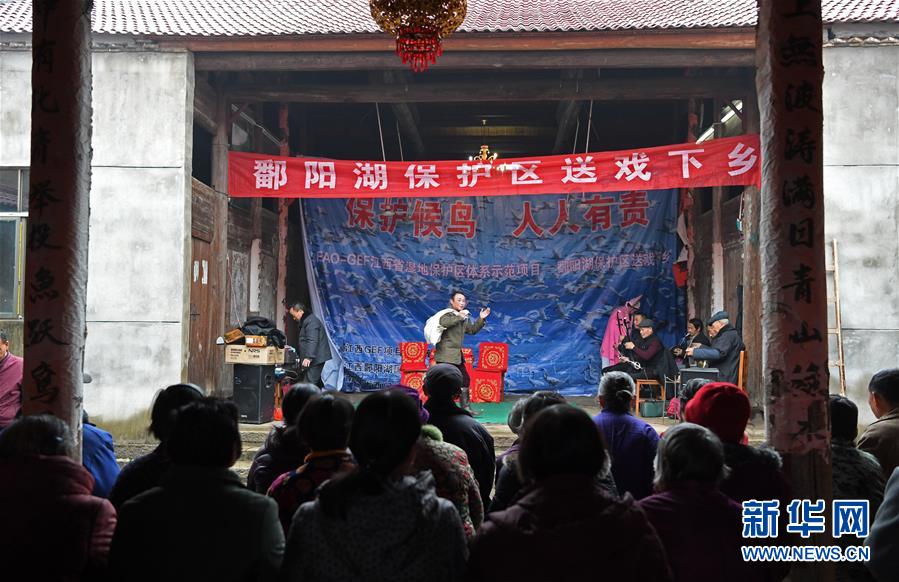 演员在江西省都昌县多宝乡马家堰村表演采茶剧《保护候鸟,人人有责》(12月20日摄)。 (配本社同题文字稿) 新华社记者 万象 摄