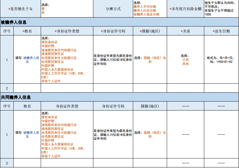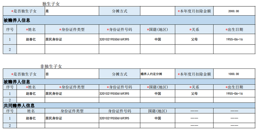 赡养老人专项附加扣除填写范例