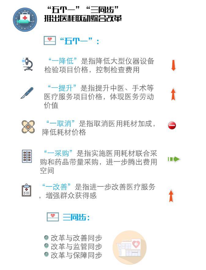 本轮医耗联动综合改革与医药分开综合改革一脉相承,方案主体内容可以概述为“五个一”,即一降低、一提升、一取消、一采购、一改善。“一降低”是指降低大型仪器设备检验项目价格,控制检查费用;“一提升”是指提升中医、手术等医疗服务项目价格,体现医务劳动价值;“一取消”是指取消医用耗材加成,降低耗材价格;“一采购”是指实施医用耗材联合采购和药品带量采购,进一步腾出费用空间;“一改善”是指进一步改善医疗服务,增强群众获得感。