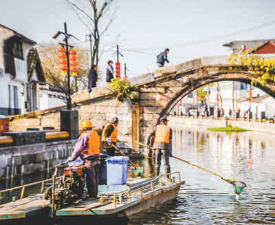 保利物业工作人员正在天凝镇应急河道开展水草清理工作。