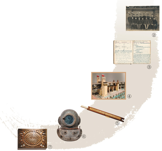 随着工程的进展,特别是江心几个桥墩的开工,需要进行深潜水作业,使用普通的潜水设备,突破空气潜水60米的深度极限,勇闯“生命禁区”。1963年初,在7号墩的潜水作业中,十几名潜水员连续突破了警戒线,下到65米深水下作业。(图⑥)
