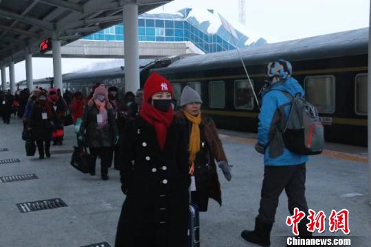 中新网哈尔滨12月30日电(刘德才 记者 史轶夫)中国铁路哈尔滨局集团有限公司30日发布信息,元旦前夕,随着深圳东至漠河Y671/2次“深新号”旅游专列抵达漠河,180余位粤港澳游客开启了北极观光之旅。这是今年“百趟专列进龙江”行动中开来的第164趟旅游专列,成为拉动地方旅游热的独特景象。