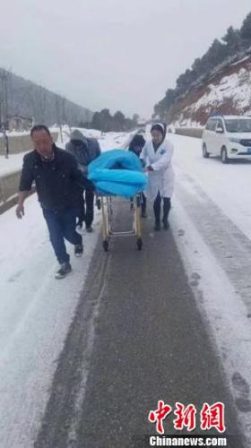 医护人员在现场实施初步诊断后,在风雪中推着担架又往返3里多路,把孕妇护送上救护车,当日16时30分顺利送达香格里拉市妇幼保健院。(陈静)