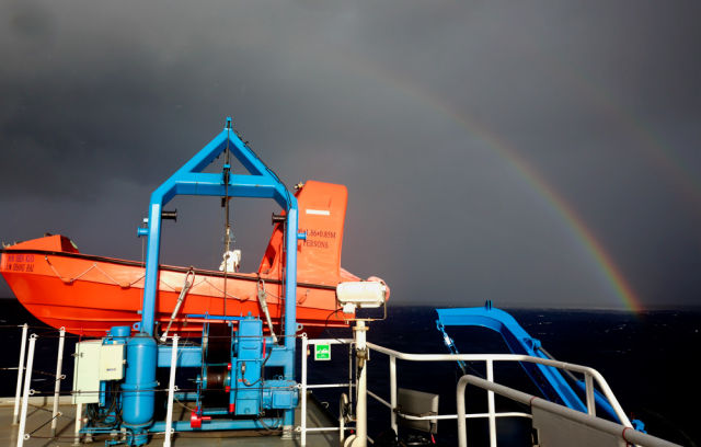 偶尔,天空中还飘来一大片乌云,水汽在海面折射出好几道彩虹。转瞬间,乌云蔽日,下起阵雨。雨过天晴,绯红的晚霞铺满天空,映红整个海面。