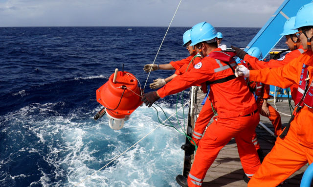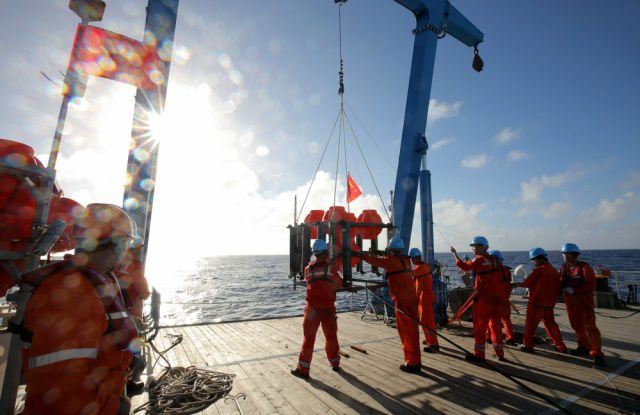 ◆考察队员在马里亚纳海沟“挑战者深渊”海域布放“彩虹鱼”着陆器。