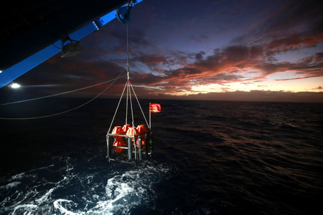 ◆考察队员将负责拍摄和诱捕生物的“彩虹鱼”第二代着陆器回收到甲板。