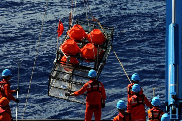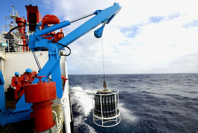 ◆考察队员在“沈括”号上布放“彩虹鱼”万米级着陆器。