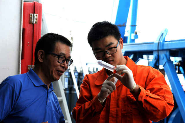 ◆“彩虹鱼”科考团队海上总指挥崔维成(左)和考察队员耿道(右)在观察捕获的深渊生物。