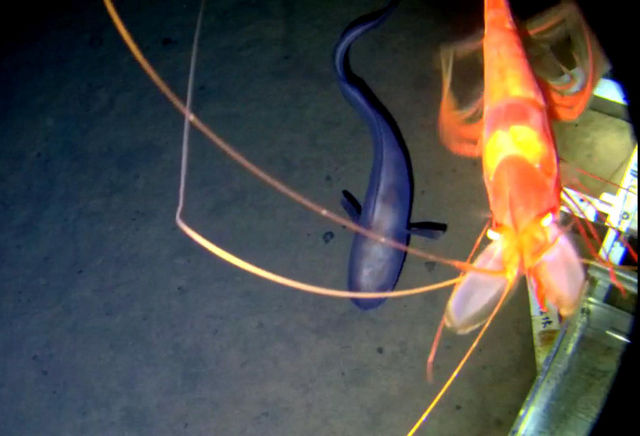◆在近6000米深的西太平洋海底,一条类似鼬鱼类的鱼和一只类似十足目的虾从“彩虹鱼”着陆器附近游过。