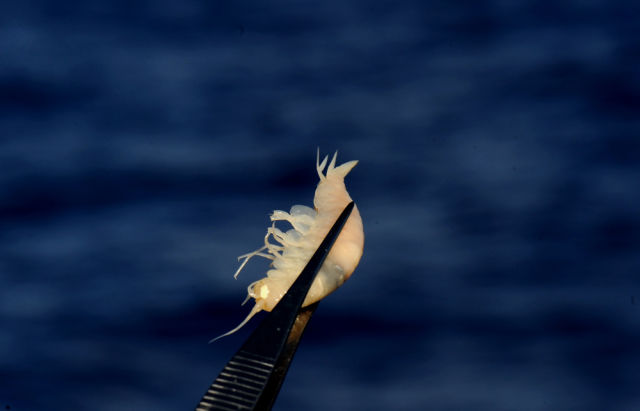 ◆“彩虹鱼”着陆器在近6000米深的西太平洋海底捕获的钩虾。