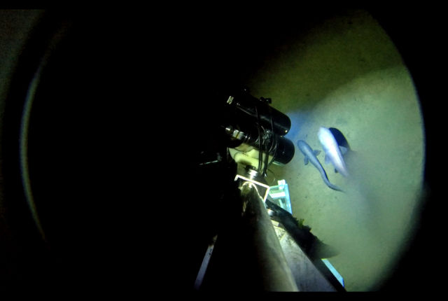 ◆在近6000米深的西太平洋海底,两条类似鼬鱼类的鱼从“彩虹鱼”着陆器附近游过。