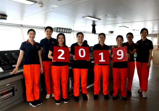记者张建松(左三)与“沈括”号女队员合影(岑志连 摄)