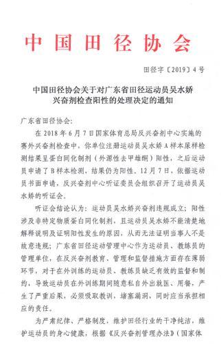 中新网1月7日电 7日下午,中国田径协会就广东省田径运动员吴水娇兴奋剂检查呈阳性的结果发布处理通知,给予运动员吴水娇禁赛四年的处罚,并负担20000元的兴奋剂检测费用。
