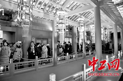 图为游客在故宫博物院午门展厅观看“贺岁迎祥——紫禁城里过大年”展览。本次展览分为文物展览和实景体验两部分,最大限度还原清代皇宫过年的场景。其中,文物展览位于午门正楼和东西雁翅楼展厅,共展出文物885件(套)。