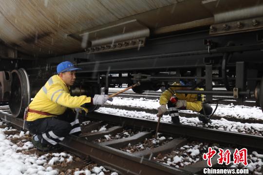 南京东车辆段货车检车员风雪里按标作业,坚守岗位保障运输安全。(刘寅 摄)