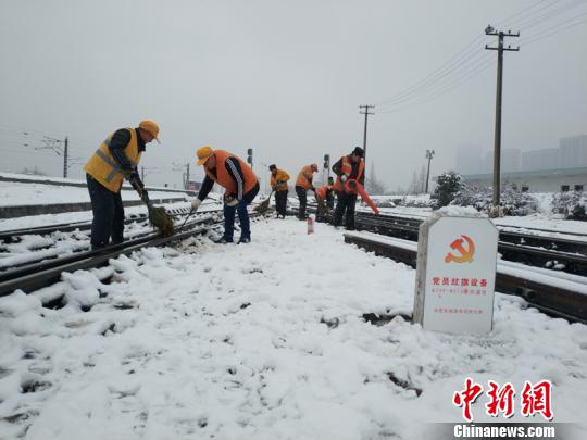 合肥工务段组织职工不间断清扫铁道线道岔积雪,保障铁路安全畅通。(窦铖 ?摄)