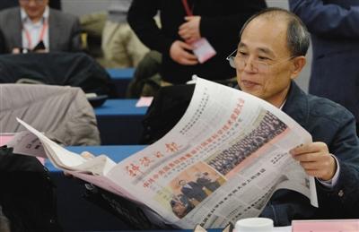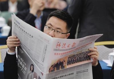 会前,参加全国科技工作会议的代表阅读《科技日报》。