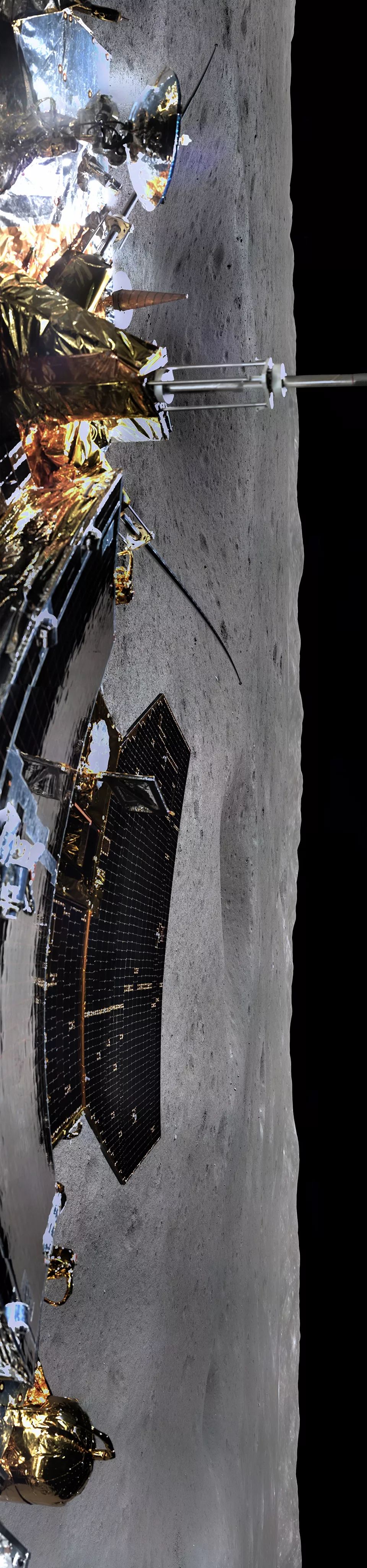 此外,着陆区周边的地形地貌在这张全景图中完整呈现。嫦娥四号的着陆区位于南极艾特肯盆地冯•卡门坑内,这里形成于36亿年前,画面中的地形也体现了这里历史古老的特点。