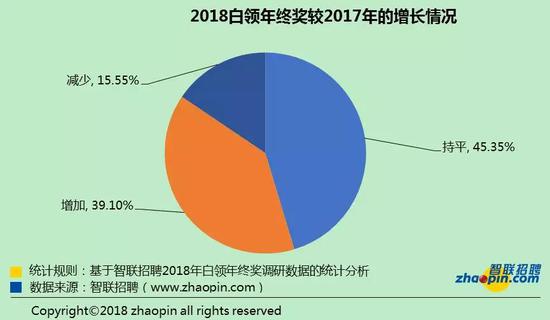 相较于2017年,仅39.10%的白领的年终奖收入增加了,持平的为45.35%,减少的为15.55%。