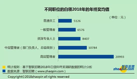 职位越高,年终奖越高。高层管理者的年终奖是普通员工的近4倍。