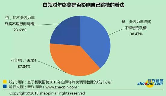 调研数据显示,38.47%的白领会因为年终奖不理想而跳槽,不跳槽的占比最低,仅为23.69%。