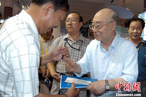 “两弹一星功勋奖章”获得者、有“中国氢弹之父”美誉的于敏院士(右)。中新社发 徐曦弋 摄
