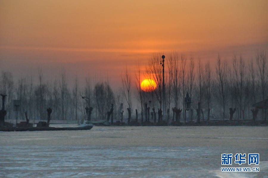 1月16日,白洋淀上朝阳正冉冉升起。新华网发(马晓 摄)