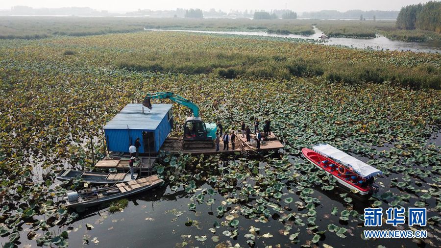 安新县水产养殖户在白洋淀清除渔场设施(2018年10月5日摄)。新华网发(张斌 摄)