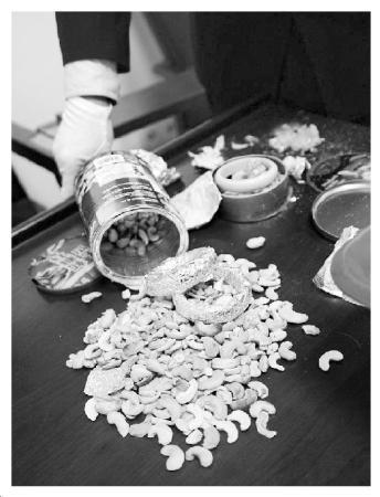 图为白云机场海关关员查获藏匿在坚果罐中的象牙手镯。邵子成 摄