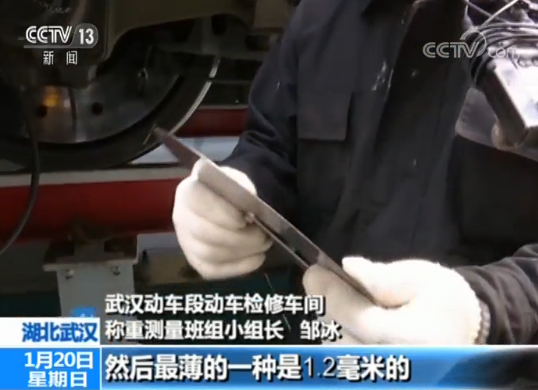 武汉动车段动车检修车间称重测量班组小组长 邹冰:我们的垫片有6种规格,然后最薄的一种是1.2毫米的厚度,也就跟我们平常用的光盘差不多吧,(重量)分布均匀之后,我们车体运行起来就会很平稳,然后旅客坐着舒适度就会高一些。