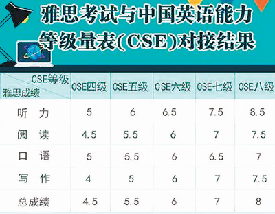日前,教育部考试中心与英国文化教育协会联合发布中国英语能力等级量表与英国英语考试雅思、普思考试的对接研究结果。今后,中国英语能力等级量表的四级到八级分别对应于雅思4.5分到8分。基于量表,我国正在研发高等教育阶段的中国英语能力等级考试。