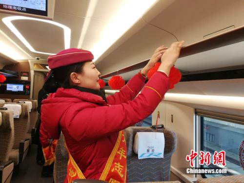 该趟列车由北京客运段职值乘,为更好地落实“平安春运,有序春运,温馨春运,让旅客体验更美好的”工作理念,铁路部门从职工培训和备品服务进行了细节上的调整,复兴号列车乘务班组进行了复兴号标准化服务培训,配备老幼病残孕五彩中国结。