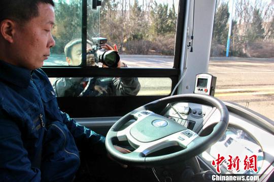 “无人驾驶公交车”驾驶座上配有一名安全员,“解放”双手、双脚,不操作方向盘、刹车、离合等汽车装置。 赵晓 摄