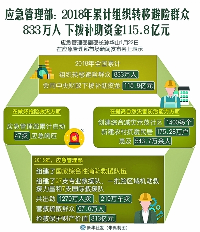 强台风“玛利亚”“山竹”、内蒙古汗马森林火灾、山东寿光洪涝灾害、云南墨江5.9级地震、四川达州商贸城火灾、天津滨海油品仓库火灾、重庆万州公交车坠江事件……2018年,面对一系列重大自然灾害及突发事件,应急管理部累计启动47次应急响应,派出60余个工作组赴地方指导开展防灾救援救灾和事故处置工作。全国累计组织转移避险群众833万人,会同中央财政下拨补助资金115.8亿元,组织调拨3.28万顶帐篷和40.9万床(件)衣被等。