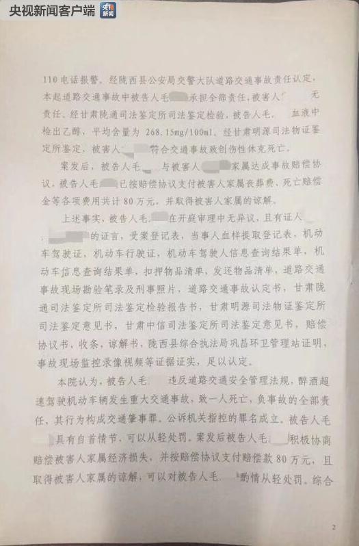 甘肃省陇西县人民法院向记者出示了这一案件的刑事判决书,判决书上显示:经陇西县人民法院审理查明:2017年9月4日4时40分许,被告人毛某某醉酒驾驶牌照为陕A×××××号小型轿车沿陇西县巩某崇文路由东向西超速行驶,车辆行驶至恒力大厦附近路段时将正在城区道路上打扫卫生的陇西县综合执法局巩昌环卫管理站职工被害人宋某碰撞,致被害人宋某当场死亡。事故发生后,被告人毛某某拨打110电话报警。经陇西县公安局交警大队道路交通事故责任认定,本起道路交通事故中被告人毛某某承担全部责任,被害人宋某无责任。经甘肃陇通司法鉴定所司法鉴定检验,被告人毛某某血液中检出乙醇,平均含量为268.15mg/100ml。经甘肃明源司法物证鉴定所鉴定,被害人宋某符合交通事故致创伤性休克死亡。