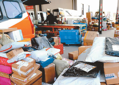 2019年1月,江苏省海安市一物流快递公司内,员工正在加班加点地分拣递送春节年货物品。资料图片