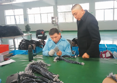 正在生产车间穿套管的残疾人员工王三朋双腿残疾。几年前,储运河找到王三朋,把他接到公司,并找技术熟练的师傅手把手传授技艺,为他安排最适合的工作岗位。王三朋十分珍惜自己的工作机会,他刻苦学习,付出了比常人更多的辛苦。如今王三朋已成为穿套管岗位的骨干,平均月工资2000多元。王三朋说,工作给了他活下去的尊严,他很高兴有一份工作。