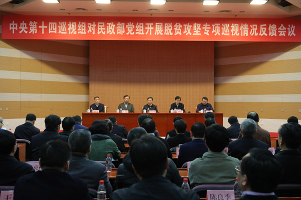 根据党中央统一部署,2018年10月18日至11月30日,中央第十四巡视组对民政部党组开展了脱贫攻坚专项巡视。巡视组坚持以习近平新时代中国特色社会主义思想为指导,深入贯彻党的十九大精神,牢固树立“四个意识”,坚定“四个自信”,把“两个维护”作为根本任务,贯彻中央巡视方针,牢牢把握脱贫攻坚专项巡视的再监督工作定位,聚焦脱贫攻坚政治责任深入开展监督检查,督促各级党组织和领导干部强化政治责任担当,推动解决脱贫攻坚过程中存在的突出问题,为如期实现脱贫攻坚目标提供坚强政治保障。中央巡视工作领导小组听取了巡视组的巡视情况汇报,并向中央政治局常委会会议报告了有关情况。