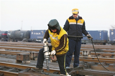 近日,阎良工务段针对春运期间车流量大、安全责任重大的实际,通过卡控安全关键、强化隐患排查、加大设备整修等措施,全力确保春运期间运输安全平稳有序。图为该段职工正在进行切割钢轨作业。(刘晓瑞 摄)