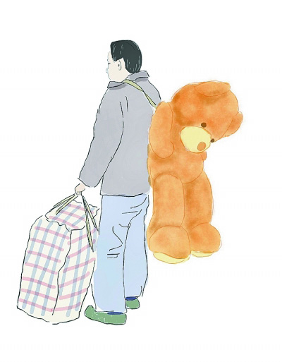 春运客流中,一位父亲背着玩具熊候车。殷燕召绘