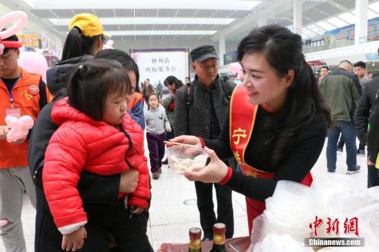 南宁铁路局工作人员为旅客、农民工包饺子、送饺子、送春联,共度小年。林馨 摄